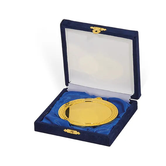 Box Portamedaglia Ricoperto In Velluto Blu Esternamente, Interno In Raso Blu Con Impronta Per Medaglia