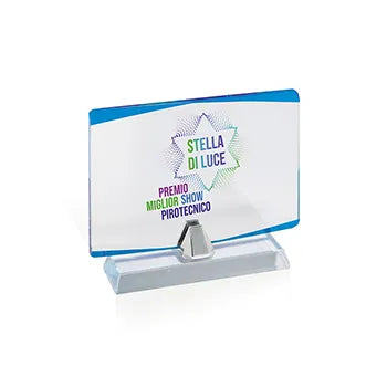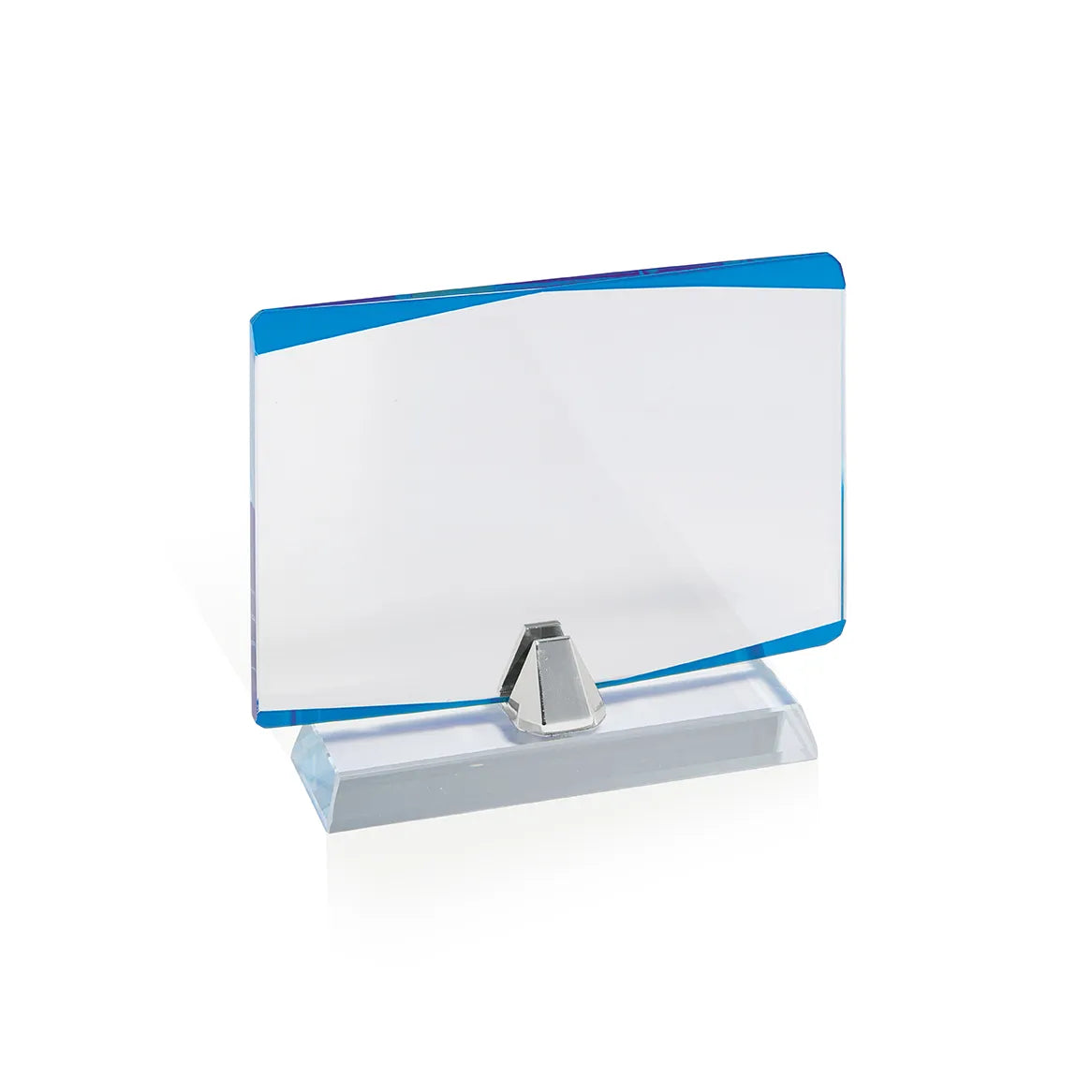 Supporto In Vetro Chiaro Con Dettagli Blu, Con Basetta Smontabile E Supportino In Metallo Argentato. Possibilita' Di Posizionare Il Vetro Sia In Verticale Che In Orrizzontale. Fornito In Scatola Elegante